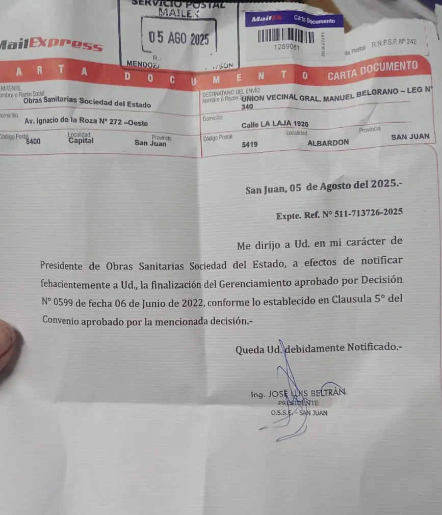 En medio de la polémica, la presidenta de la Unión Vecinal Manuel Belgrano, Alejandra Perona, rompió el silencio para aclarar que la institución no solicitó hacerse cargo del servicio. Según explicó, la transferencia fue una determinación impuesta unilateralmente por OSSE tras una notificación recibida en agosto.